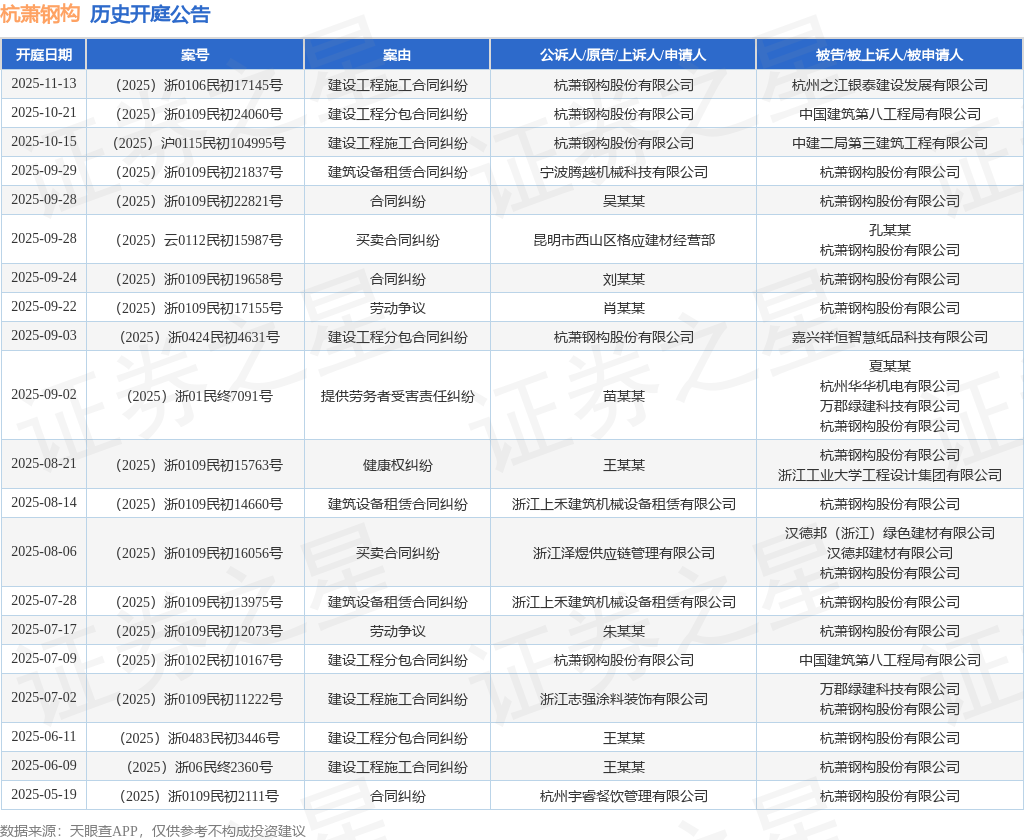 案号:(2025)浙0106民初17145号根据统计,近一年内以杭萧钢构股份有限公司为当事人的历史开庭公告有29则,其中案由为“建设工程施工合同纠纷”的公告以5则居首,其次为“合同纠纷”有4则,“建筑设备租赁合同纠纷”有4则。历史开庭公告(前20条)如下: