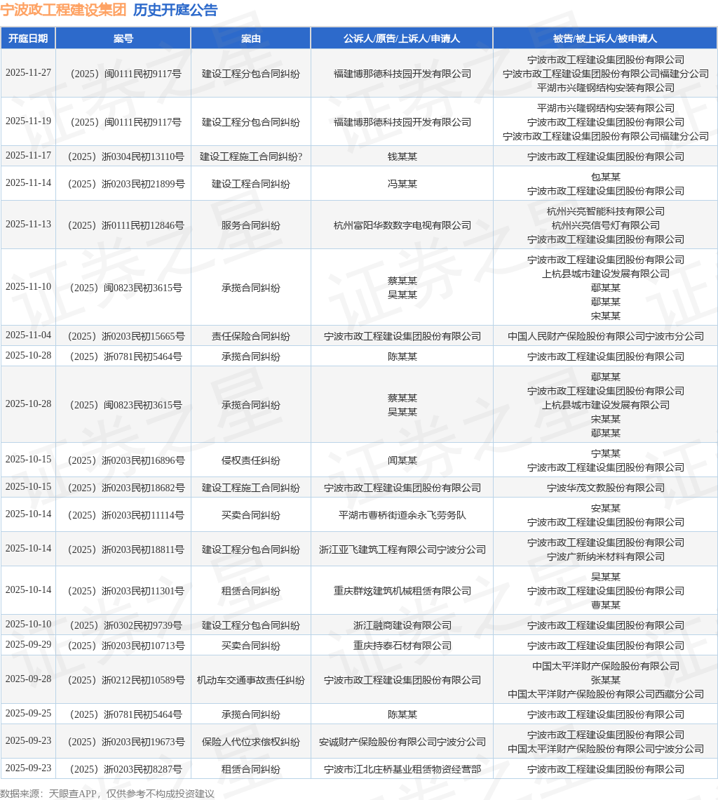 案号:(2025)浙0111民初12846号根据统计,近一年内以宁波市政工程建设集团股份有限公司为当事人的历史开庭公告有88则,其中案由为“建设工程施工合同纠纷”的公告以13则居首,其次为“建设工程分包合同纠纷”有11则,“买卖合同纠纷”有9则。历史开庭公告(前20条)如下:
