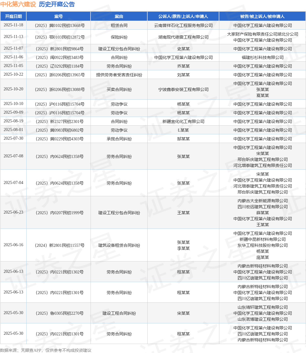 案号:(2025)鄂0103民初12872号根据统计,近一年内以中国化学工程第六建设有限公司为当事人的历史开庭公告有81则,其中案由为“劳务合同纠纷”的公告以28则居首,其次为“建设工程施工合同纠纷”有12则,“劳动争议”有8则。历史开庭公告(前20条)如下: