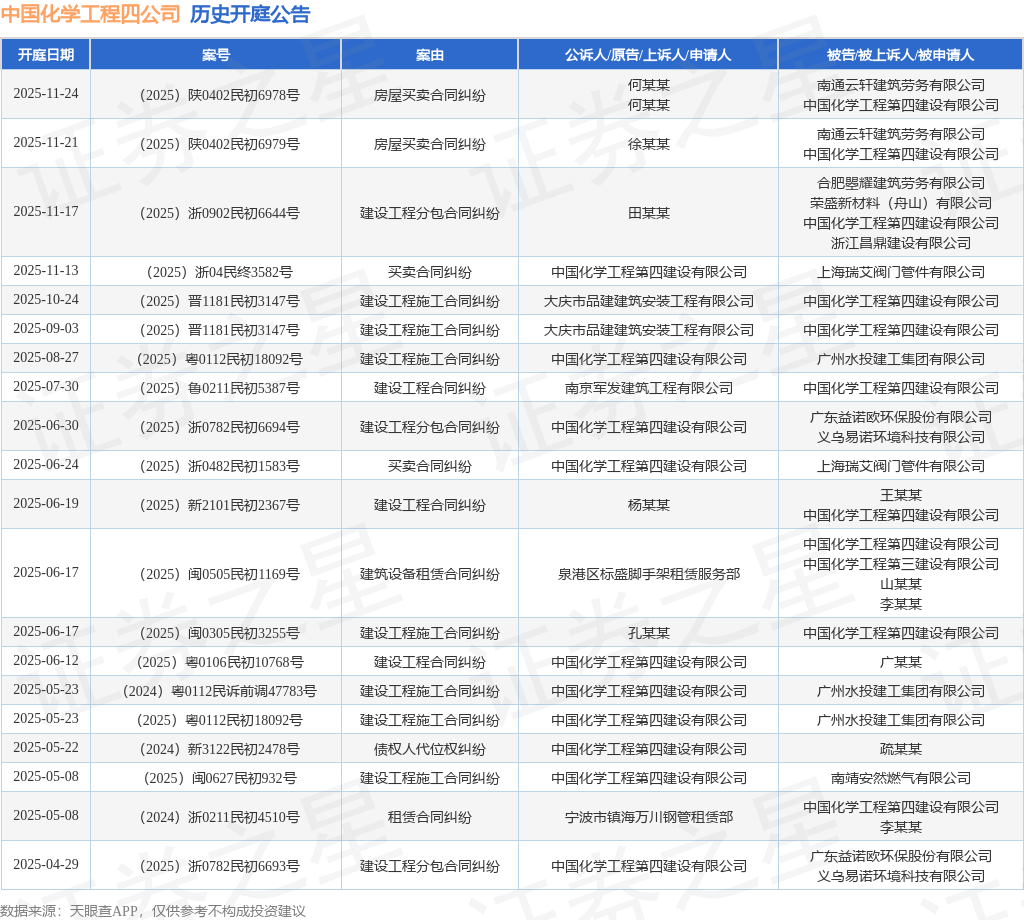 案号:(2025)浙04民终3582号根据统计,近一年内以中国化学工程第四建设有限公司为当事人的历史开庭公告有57则,其中案由为“建设工程施工合同纠纷”的公告以21则居首,其次为“建设工程合同纠纷”有8则,“建筑设备租赁合同纠纷”有6则。历史开庭公告(前20条)如下: