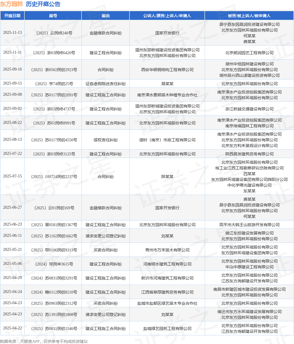 案号:(2025)云民终240号根据统计,近一年内以北京东方园林环境股份有限公司为当事人的历史开庭公告有81则,其中案由为“建设工程施工合同纠纷”的公告以37则居首,其次为“借款合同纠纷”有10则,“建设工程合同纠纷”有9则。历史开庭公告(前20条)如下: