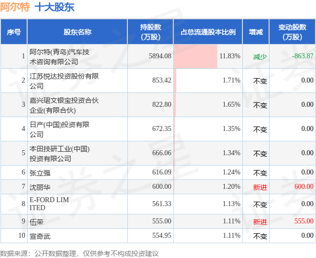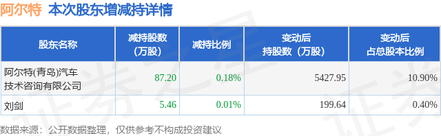 证券之星消息,11月10日阿尔特发布公告《阿尔特:关于控股股东及其一致行动人减持计划实施完成的公告》,其股东阿尔特(青岛)汽车技术咨询有限公司、刘剑于2025年11月7日合计减持92.66万股,占公司目前总股本的0.1861%,变动期间该股股价下跌0.43%,截止11月7日收盘报11.47元。