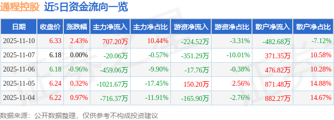 证券之星消息,截至2025年11月10日收盘,通程控股(000419)报收于6.33元,上涨2.43%,换手率1.99%,成交量10.79万手,成交额6775.32万元。