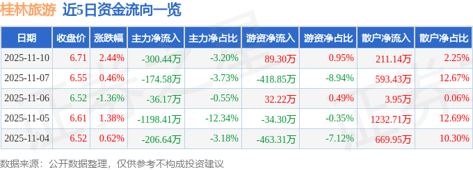 证券之星消息,截至2025年11月10日收盘,桂林旅游(000978)报收于6.71元,上涨2.44%,换手率3.01%,成交量14.08万手,成交额9391.7万元。