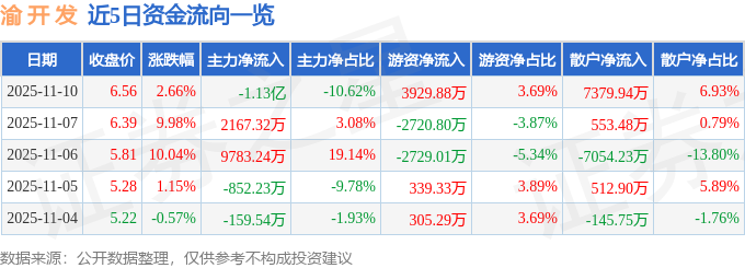 证券之星消息,截至2025年11月10日收盘,渝 开 发(000514)报收于6.56元,上涨2.66%,换手率19.47%,成交量164.27万手,成交额10.65亿元。