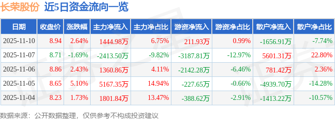 11月10日的资金流向数据方面,主力资金净流入1444.98万元,占总成交额6.75%,游资资金净流入211.93万元,占总成交额0.99%,散户资金净流出1656.91万元,占总成交额7.74%。