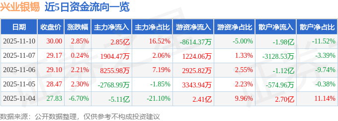 证券之星消息,截至2025年11月10日收盘,兴业银锡(000426)报收于30.0元,上涨2.85%,换手率3.24%,成交量57.53万手,成交额17.23亿元。