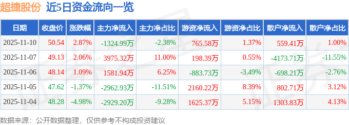 证券之星消息,截至2025年11月10日收盘,超捷股份(301005)报收于50.54元,上涨2.87%,换手率8.19%,成交量10.84万手,成交额5.57亿元。