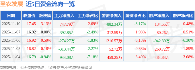证券之星消息,截至2025年11月10日收盘,圣农发展(002299)报收于17.45元,上涨3.13%,换手率1.32%,成交量16.17万手,成交额2.78亿元。