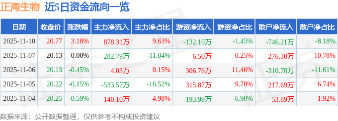 证券之星消息,截至2025年11月10日收盘,正海生物(300653)报收于20.77元,上涨3.18%,换手率2.45%,成交量4.41万手,成交额9118.01万元。