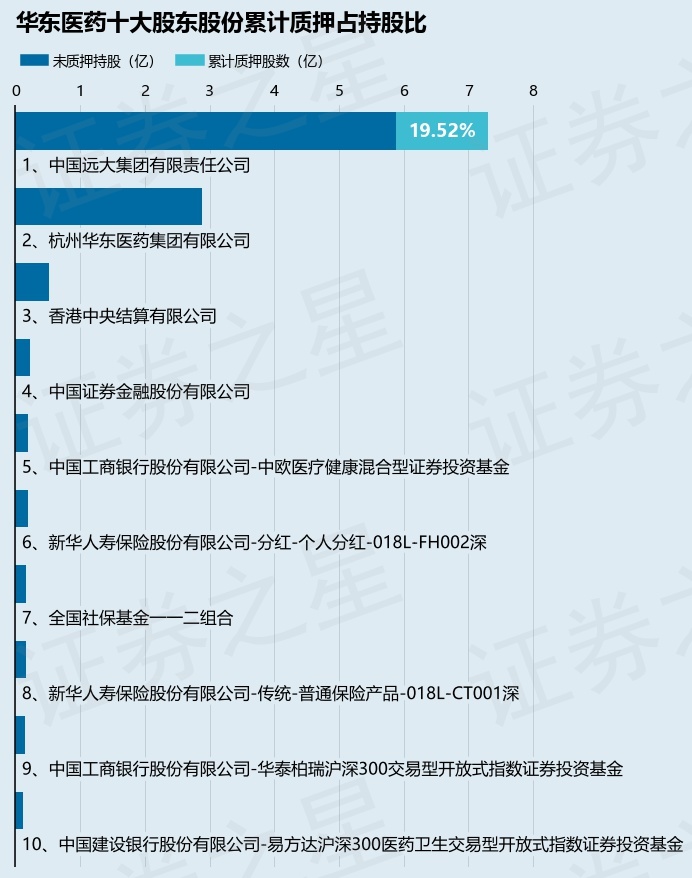 截止本公告日,股东中国远大集团有限责任公司已累计质押股份1.43亿股,占其持股总数的19.52%。本次质押后华东医药十大股东的累计质押股份占持股比例(占持股比例的计算以公司最新一期财务报表公布的十大股东的持股总数为基准)见下图: