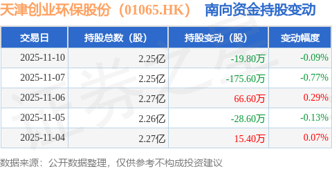 证券之星消息,11月10日南向资金减持19.8万股天津创业环保股份(01065.HK)。近5个交易日中,获南向资金减持的有3天,累计净减持142.0万股。近20个交易日中,获南向资金增持的有10天,累计净增持492.6万股。截至目前,南向资金持有天津创业环保股份(01065.HK)2.25亿股,占公司已发行普通股的66.15%。
