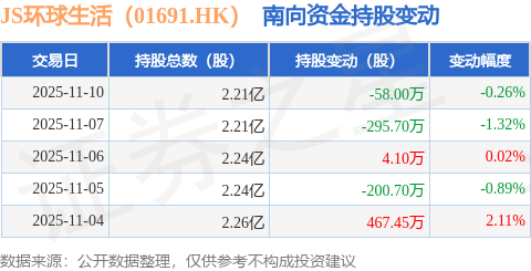 证券之星消息,11月10日南向资金减持58.0万股JS环球生活(01691.HK)。近5个交易日中,获南向资金减持的有3天,累计净减持82.85万股。近20个交易日中,获南向资金增持的有11天,累计净增持1387.35万股。截至目前,南向资金持有JS环球生活(01691.HK)2.21亿股,占公司已发行普通股的6.34%。