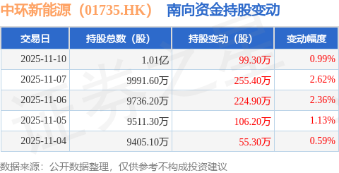 证券之星消息,11月10日南向资金增持99.3万股中环新能源(01735.HK)。近5个交易日中,获南向资金增持的有5天,累计净增持741.1万股。近20个交易日中,获南向资金增持的有17天,累计净增持2769.3万股。截至目前,南向资金持有中环新能源(01735.HK)1.01亿股,占公司已发行普通股的2.38%。