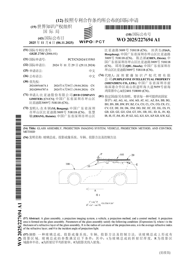 证券之星消息,根据企查查数据显示比亚迪(002594)公布了一项国际专利申请,专利名为“玻璃总成、投影成像系统、车辆、投影方法及控制方法”,专利申请号为PCT/CN2024/135503,国际公布日为2025年11月6日。