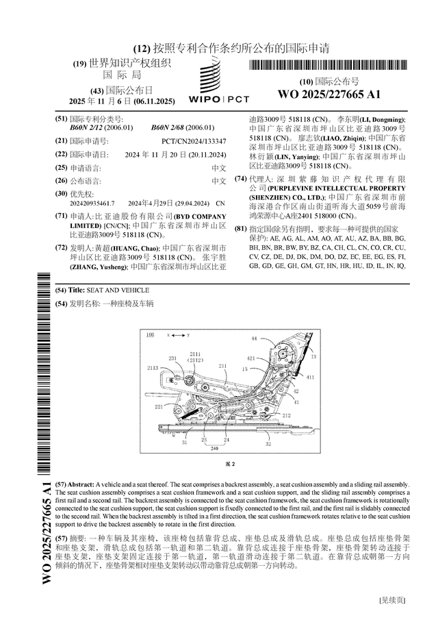 证券之星消息,根据企查查数据显示比亚迪(002594)公布了一项国际专利申请,专利名为“一种座椅及车辆”,专利申请号为PCT/CN2024/133347,国际公布日为2025年11月6日。