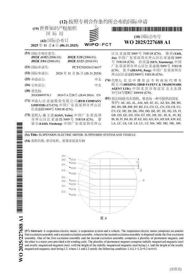 证券之星消息,根据企查查数据显示比亚迪(002594)公布了一项国际专利申请,专利名为“悬浮电机、悬架系统及车辆”,专利申请号为PCT/CN2024/134637,国际公布日为2025年11月6日。