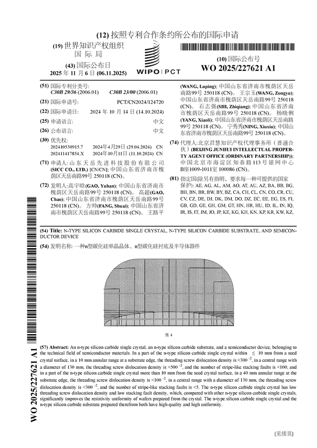 证券之星消息,根据企查查数据显示天岳先进(688234)公布了一项国际专利申请,专利名为“一种n型碳化硅单晶晶体、n型碳化硅衬底及半导体器件”,专利申请号为PCT/CN2024/124720,国际公布日为2025年11月6日。