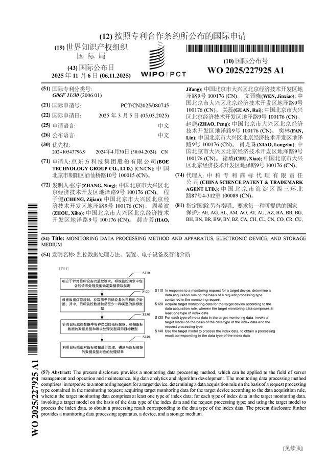 证券之星消息,根据企查查数据显示京东方A(000725)公布了一项国际专利申请,专利名为“监控数据处理方法、装置、电子设备及存储介质”,专利申请号为PCT/CN2025/080745,国际公布日为2025年11月6日。