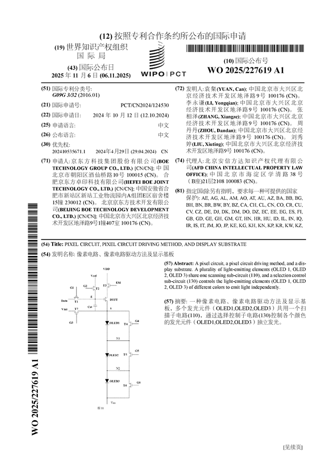 证券之星消息,根据企查查数据显示京东方A(000725)公布了一项国际专利申请,专利名为“像素电路、像素电路驱动方法及显示基板”,专利申请号为PCT/CN2024/124530,国际公布日为2025年11月6日。