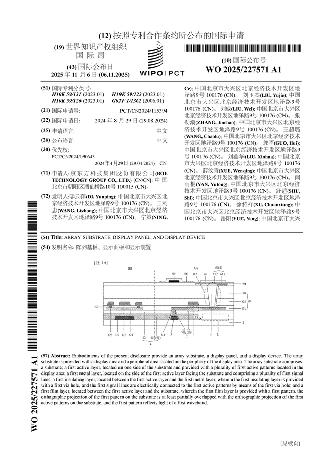 证券之星消息,根据企查查数据显示京东方A(000725)公布了一项国际专利申请,专利名为“阵列基板、显示面板和显示装置”,专利申请号为PCT/CN2024/115394,国际公布日为2025年11月6日。