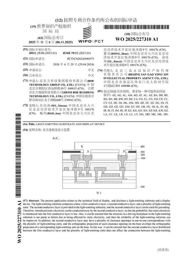 证券之星消息,根据企查查数据显示京东方A(000725)公布了一项国际专利申请,专利名为“发光基板及显示装置”,专利申请号为PCT/CN2024/090573,国际公布日为2025年11月6日。