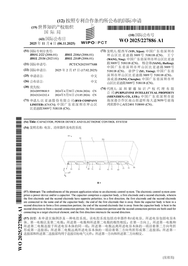 证券之星消息,根据企查查数据显示比亚迪(002594)公布了一项国际专利申请,专利名为“电容、功率器件及电控系统”,专利申请号为PCT/CN2025/077688,国际公布日为2025年11月6日。