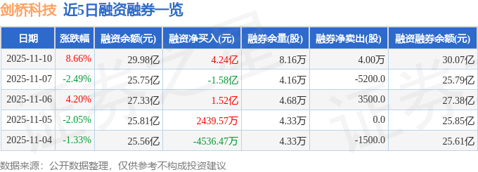 剑桥科技融资融券信息显示,融资方面,当日融资买入10.73亿元,融资偿还6.49亿元,融资净买入4.24亿元,净买入额两市排名第1。融券方面,融券卖出4.02万股,融券偿还200.0股,融券余量8.16万股,融券余额901.76万元。融资融券余额30.07亿元。