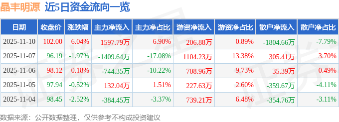 证券之星消息,截至2025年11月10日收盘,晶丰明源(688368)报收于102.0元,上涨6.04%,换手率2.58%,成交量2.28万手,成交额2.32亿元。