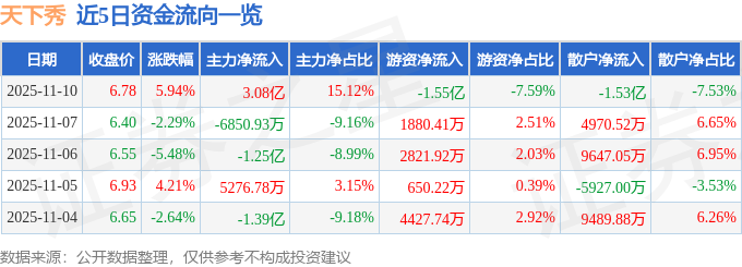 证券之星消息,截至2025年11月10日收盘,天下秀(600556)报收于6.78元,上涨5.94%,换手率16.47%,成交量297.8万手,成交额20.36亿元。