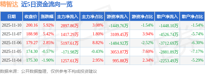 证券之星消息,截至2025年11月10日收盘,精智达(688627)报收于200.16元,上涨5.92%,换手率6.48%,成交量4.69万手,成交额9.41亿元。