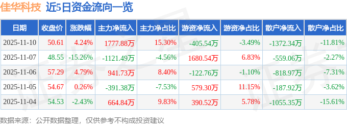证券之星消息,截至2025年11月10日收盘,佳华科技(688051)报收于50.61元,上涨4.24%,换手率2.99%,成交量2.31万手,成交额1.16亿元。