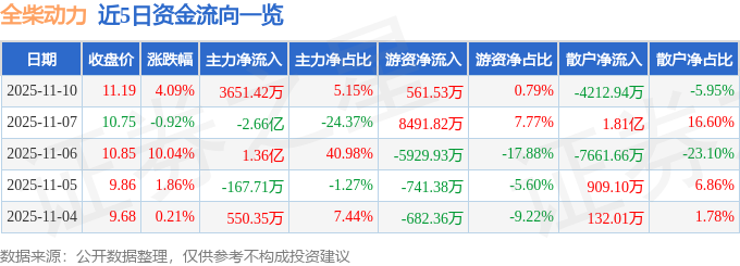 证券之星消息,截至2025年11月10日收盘,全柴动力(600218)报收于11.19元,上涨4.09%,换手率14.87%,成交量64.78万手,成交额7.08亿元。