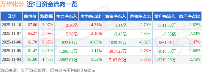 证券之星消息,截至2025年11月10日收盘,万华化学(600309)报收于67.86元,上涨3.97%,换手率2.51%,成交量78.66万手,成交额53.31亿元。