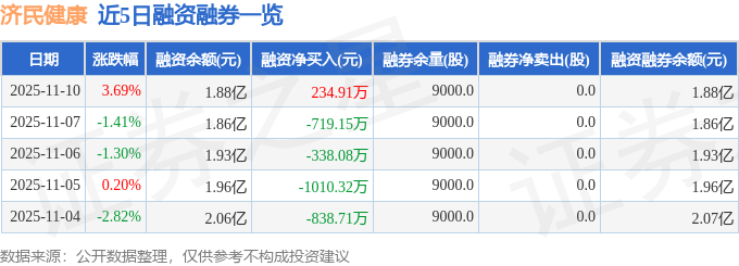 证券之星消息,截至2025年11月10日收盘,济民健康(603222)报收于10.12元,上涨3.69%,换手率7.55%,成交量39.63万手,成交额3.99亿元。