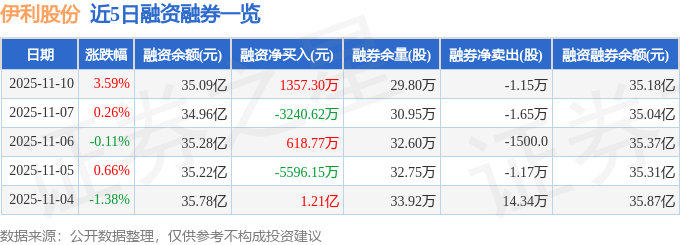 伊利股份融资融券信息显示,融资方面,当日融资买入3.09亿元,融资偿还2.95亿元,融资净买入1357.3万元。融券方面,融券卖出11.78万股,融券偿还12.93万股,融券余量29.8万股,融券余额842.45万元。融资融券余额35.18亿元。