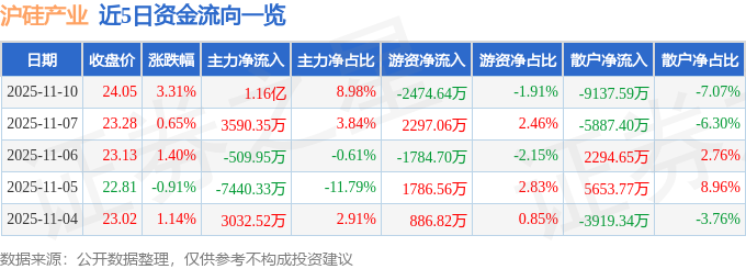 证券之星消息,截至2025年11月10日收盘,沪硅产业(688126)报收于24.05元,上涨3.31%,换手率1.97%,成交量53.87万手,成交额12.93亿元。