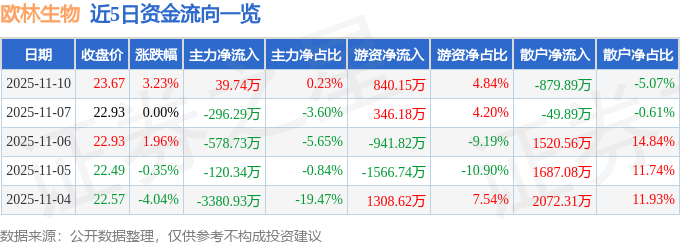 证券之星消息,截至2025年11月10日收盘,欧林生物(688319)报收于23.67元,上涨3.23%,换手率1.83%,成交量7.41万手,成交额1.74亿元。
