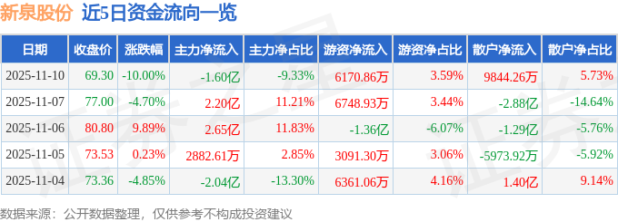 证券之星消息,截至2025年11月10日收盘,新泉股份(603179)报收于69.3元,下跌10.0%,跌停,换手率4.75%,成交量24.24万手,成交额17.17亿元。