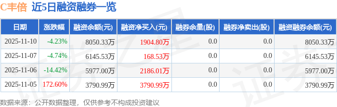 C丰倍融资融券信息显示,融资方面,当日融资买入3658.92万元,融资偿还1754.12万元,融资净买入1904.8万元,连续3日净买入累计4259.34万元。融券方面,融券卖出0.0股,融券偿还0.0股,融券余量0.0股,融券余额0.0万元。融资融券余额8050.33万元。