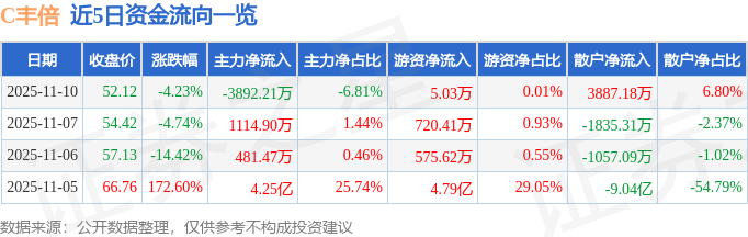证券之星消息,截至2025年11月10日收盘,C丰倍(603334)报收于52.12元,下跌4.23%,换手率34.87%,成交量10.83万手,成交额5.72亿元。