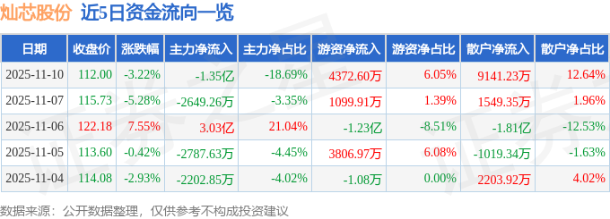 证券之星消息,截至2025年11月10日收盘,灿芯股份(688691)报收于112.0元,下跌3.22%,换手率9.09%,成交量6.5万手,成交额7.23亿元。