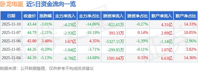 证券之星消息,截至2025年11月10日收盘,卧龙电驱(600580)报收于43.44元,下跌3.01%,换手率4.41%,成交量68.88万手,成交额30.1亿元。