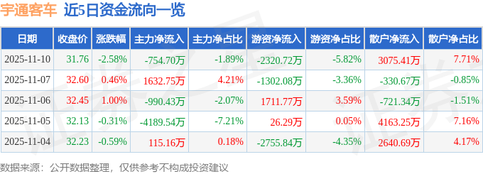 证券之星消息,截至2025年11月10日收盘,宇通客车(600066)报收于31.76元,下跌2.58%,换手率0.56%,成交量12.48万手,成交额3.99亿元。