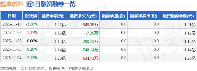 超卓航科融资融券信息显示,融资方面,当日融资买入1720.83万元,融资偿还771.48万元,融资净买入949.35万元。融券方面,融券卖出0.0股,融券偿还0.0股,融券余量0.0股,融券余额0.0万元。融资融券余额1.21亿元。