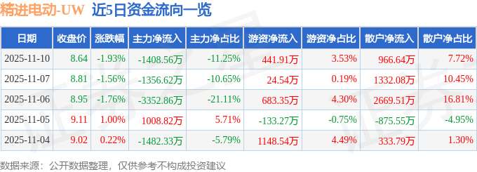 证券之星消息,截至2025年11月10日收盘,精进电动(688280)报收于8.64元,下跌1.93%,换手率2.78%,成交量14.45万手,成交额1.25亿元。