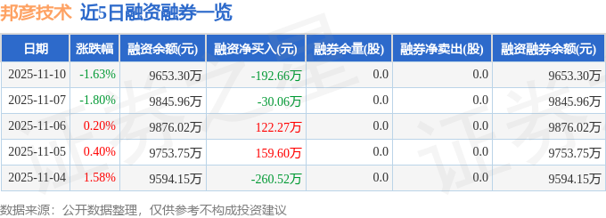 邦彦技术融资融券信息显示,融资方面,当日融资买入423.77万元,融资偿还616.43万元,融资净偿还192.66万元。融券方面,融券卖出0.0股,融券偿还0.0股,融券余量0.0股,融券余额0.0万元。融资融券余额9653.3万元。