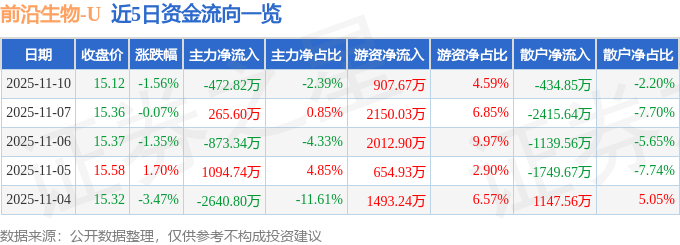 证券之星消息,截至2025年11月10日收盘,前沿生物(688221)报收于15.12元,下跌1.56%,换手率3.45%,成交量12.92万手,成交额1.98亿元。