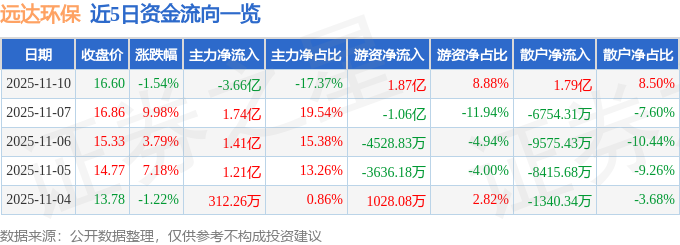 证券之星消息,截至2025年11月10日收盘,远达环保(600292)报收于16.6元,下跌1.54%,换手率15.32%,成交量119.62万手,成交额21.06亿元。