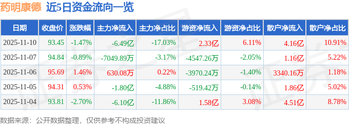 证券之星消息,截至2025年11月10日收盘,药明康德(603259)报收于93.45元,下跌1.47%,换手率1.65%,成交量40.86万手,成交额38.09亿元。
